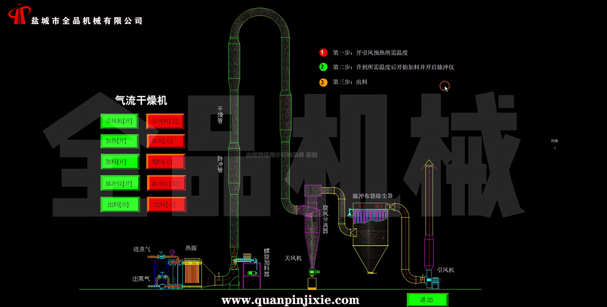 上述這類物料具有特殊性:比重輕,加料難,易燃,易爆。針對此情況,我公司技術部門開發(fā)研制的新型氣流干燥機,在原氣流干燥機的基礎上改進了加料形式,解決了“架橋”現(xiàn)象。創(chuàng)新改進了旋風分離器,解決了物料翻滾不出料的現(xiàn)象。系統(tǒng)集成,控制先進,超溫報警連鎖關閉熱源,有效解決了溫度過高引起的燃燒爆炸問題。